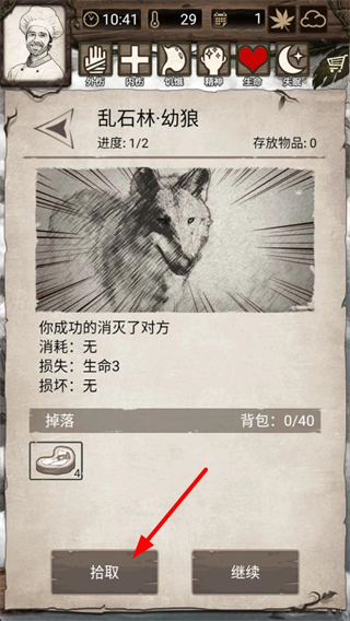 2、戰斗勝利后點擊拾取,獲取掉落的肉類資源,補充饑餓值,維持角色生存狀態,繼續探索地圖。