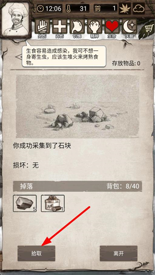 4、采集石塊后點擊拾取,獲取石塊和其他資源,豐富背包物資,為生火烤食等生存活動提供支持。