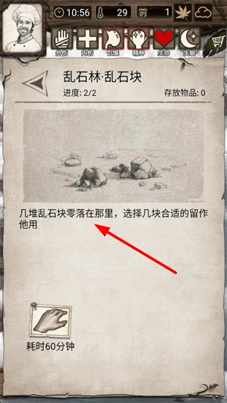 3、在亂石林采集亂石塊,消耗時間獲取石塊資源,用于建造或制作工具,提升生存和發展能力。