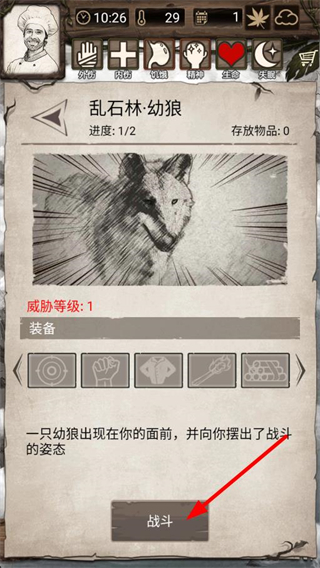 1、遭遇亂石林幼狼,點擊戰斗,擊敗幼狼獲取資源,提升生存能力,為后續冒險積累物資。