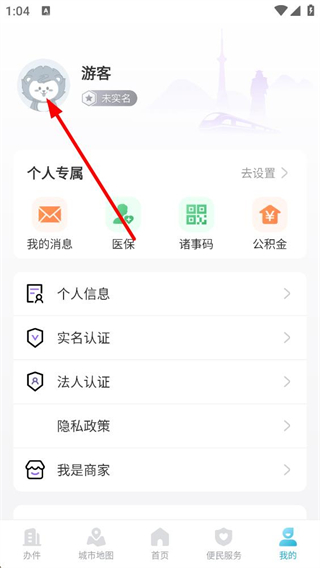 2、進入我的頁面,呈現游客未實名狀態,含我的消息醫保等個人專屬功能,還有個人信息實名認證等多項操作選項。