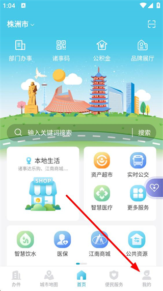 1、進入諸事達首頁,顯示株洲市相關功能入口,含部門辦事諸事碼等板塊,還有本地生活資產超市等服務,點擊我的進入對應頁面。