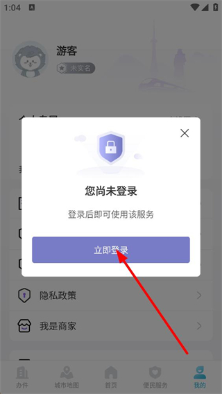 3、我的頁面操作后彈出尚未登錄提示,提示登錄后可使用服務,點擊立即登錄按鈕,進入對應的登錄流程界面。
