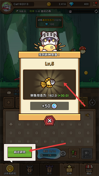 3、找到新種魚類,獲得魚類后可提升攻擊力量,還能獲得鉆石獎勵,點擊前往研究可進一步探索魚類的作用。