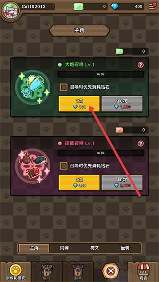 1、在主角界面,可進行大焰召喚和技能召喚,每次召喚可選擇1次或10次,召喚時優先消耗鉆石,以此獲得助力冒險的角色或技能。