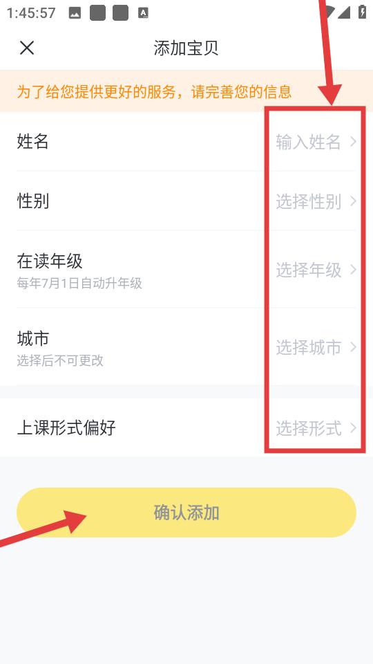 2、添加寶貝頁面頂部提示完善信息,列表呈現姓名性別在讀年級城市上課形式等填寫項,每項右側設輸入或選擇入口,完成后點擊底部確認添加按鈕。
