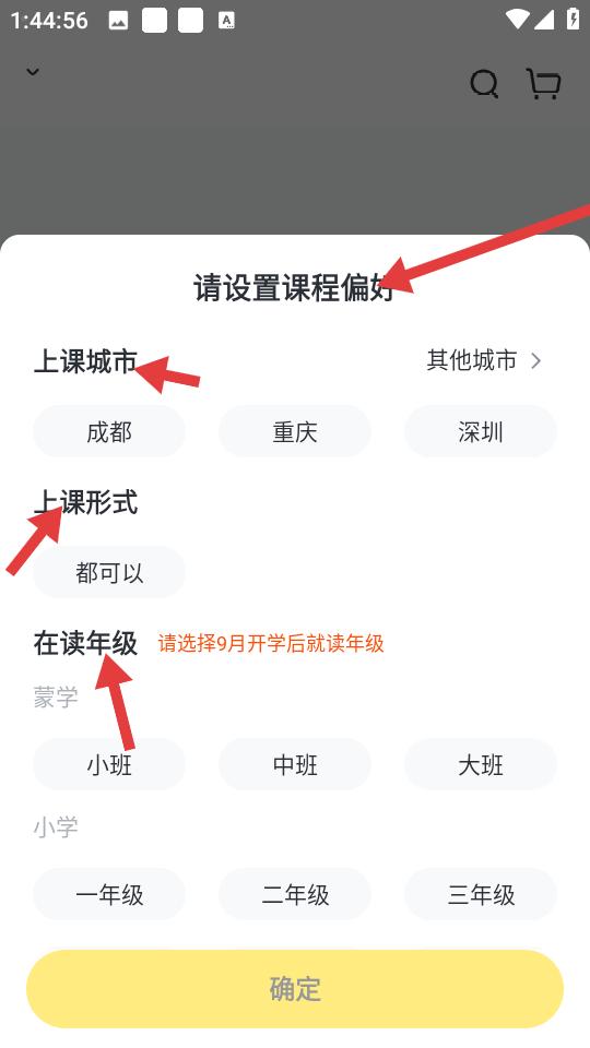 3、彈出課程偏好設置彈窗標題指引設置方向,依次羅列上課城市上課形式在讀年級,確定按鈕收尾,方便定制學習需求。