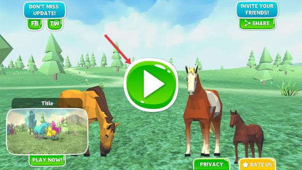 1、進入游戲,看到有馬匹和草地的界面,點擊綠色播放按鈕,開啟小馬的冒險之旅,開啟在草原的探索。