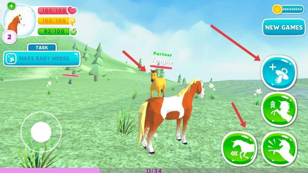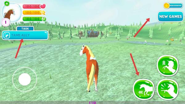 2、操控小馬在草原移動,界面左側有任務提示,如TAME ALLY,右側有技能按鈕,可使用技能,還能查看NEW GAMES。