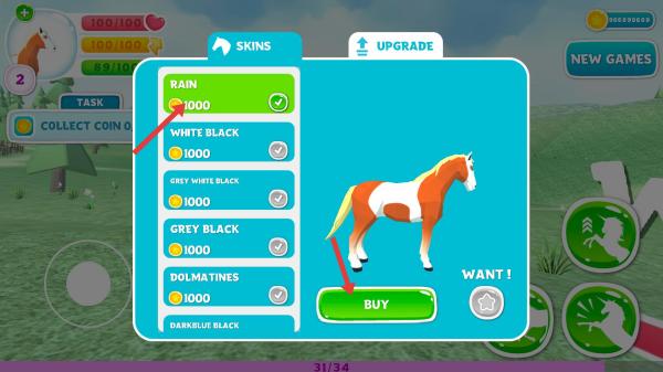 4、在皮膚界面,可選擇不同外觀的皮膚,如WHITE BLACK等,花費金幣點擊BUY就能為小馬更換皮膚。