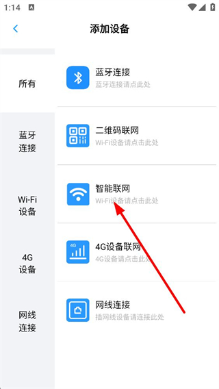 2、點擊加號進入添加設備頁面,左側有設備類型分類,右側提供藍牙連接二維碼聯網智能聯網等多種方式,可根據設備類型選擇對應的聯網方式。