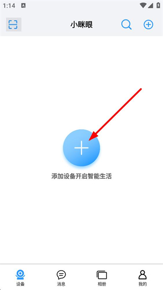 1、進入小瞇眼的設備頁面,能看到藍加號按鈕,提示添加設備開啟智能生活,底部有設備消息相冊我的等導航欄,點擊加號可進入添加設備的操作頁面。