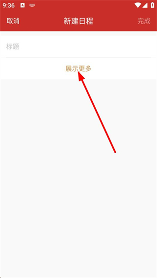 2、點擊加號后進入新建日程界面,能看到標題輸入區域,點擊展示更多按鈕,可展開更多用于設置日程的相關選項內容。