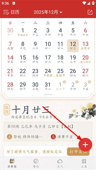 1、進入界面后看到2025年12月的日歷展示,包含公歷農歷日期、宜忌等信息,點擊右下角加號按鈕,即可進入新建日程的操作頁面。