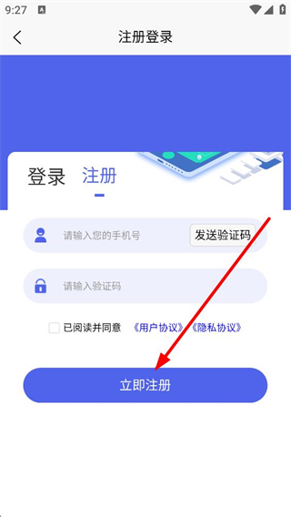 4、若注冊賬號,需輸入手機號、驗證碼,閱讀并同意相關協議后點擊立即注冊,完成賬號注冊流程。