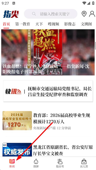 1、進入指尖APP新聞頁面,可看到首頁、第一教育等多個欄目,還有各類新聞資訊,能瀏覽不同領域的新聞內容。