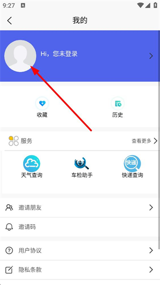 2、點擊底部相關按鈕進入我的頁面,可看到未登錄狀態,能使用收藏、歷史功能,還有天氣查詢、車檢助手等服務。