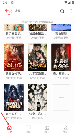1、進入書架頁查看已收藏的小說列表,各小說標注更新時間,點擊對應小說即可繼續閱讀,也能通過號添加新小說。