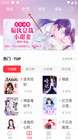 2、進入書城女生頻道,瀏覽女生向小說推薦內容,含熱門榜單分類,可查看作品評分,便于選擇感興趣的小說。