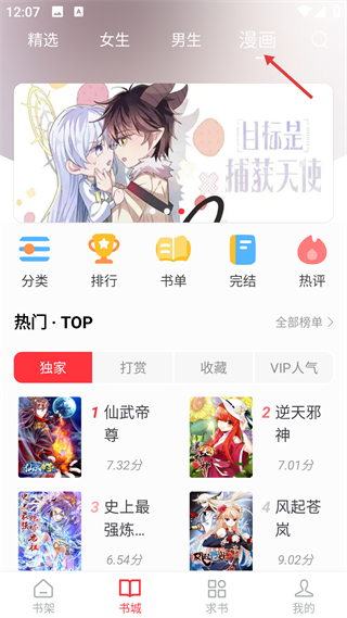 4、進入書城漫畫頻道,瀏覽漫畫內容,含分類排行等功能入口,還有熱門漫畫榜單,能快速找到熱門作品。