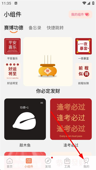 1、進入小組件頁面,含賽博功德等分類,有平安喜樂等小組件及敲木魚功能,點擊底部我的按鈕,可進入對應的個人界面。