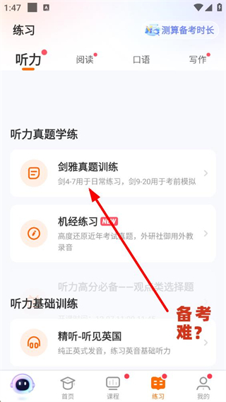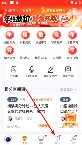 1、進入雅思備考通首頁,可見劍雅聽力劍雅閱讀等學習功能入口,還有提分直播課板塊可預約課程,點擊底部練習按鈕,進入練習頁面開展專項學習訓練。