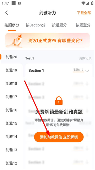 3、進入劍雅聽力頁面,可按順序Section等方式分類查看劍雅系列真題,部分真題需添加助教微信并回復關鍵字解鎖,解鎖后可使用對應真題內容。