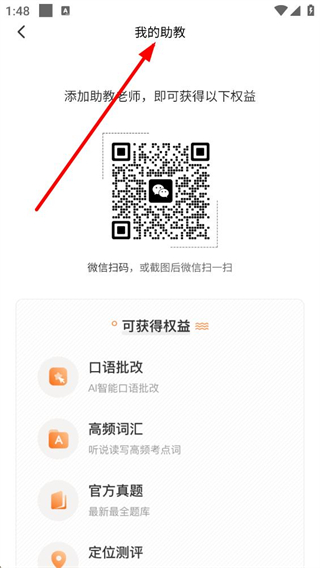 4、點擊添加助教微信進入我的助教頁面,掃碼添加助教可獲得口語批改、高頻詞匯、官方真題等備考權益,輔助雅思各板塊的學習與備考提升。