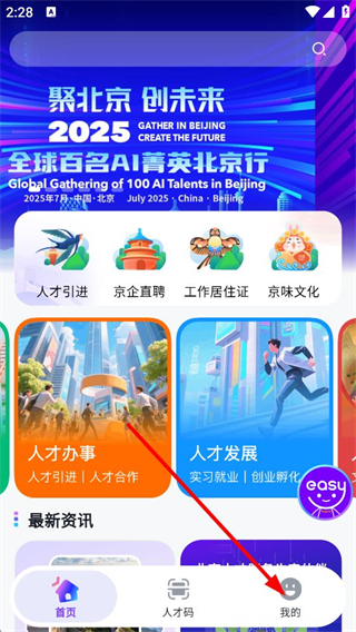 1、首頁可使用人才引進京企直聘等功能,了解菁英北京行相關服務,點擊底部我的按鈕,可進入個人中心頁面。