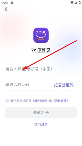 3、進入歡迎登錄頁面,選擇驗證碼登錄方式,輸入郵箱或手機號獲取驗證碼,勾選協議后即可完成登錄操作。