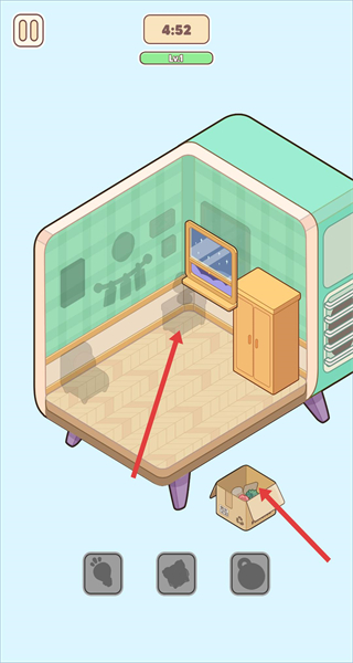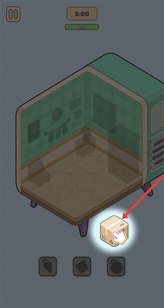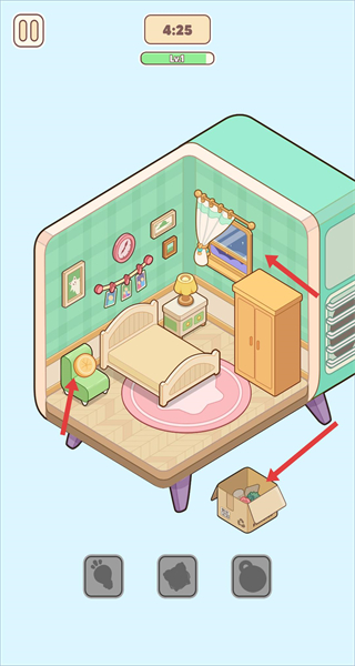1、進入游戲點擊發光的紙箱開啟房間布置,利用5分鐘倒計時從箱里獲取家具,優先規劃大件擺放位置奠定房間布局基礎。