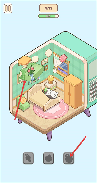 4、細化裝飾添加抱枕等軟裝,點擊下方啞鈴狀道具或可加速裝修讓床鋪座椅更溫馨,完成全場景的精致布置。