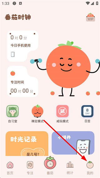 1、進入番茄時鐘主界面,可看到今日手機使用和專注時間的統計區域,還有自習室禪定模式戒玩模式日簽等功能入口,點擊底部我的可進入個人相關界面。