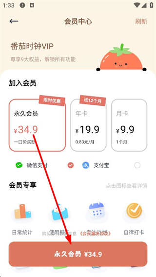 4、進入會員中心可查看番茄時鐘VIP的權益,有永久會元年卡月卡等會員套餐可選,選定永久會員后,可通過微信支付或支付寶完成購買操作。