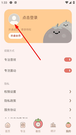 2、我的界面能看到點擊登錄和開通會員的選項,還有提醒方式相關的專注音效專注震動設置,以及隱私相關的權限設置隱私政策服務協議等內容。