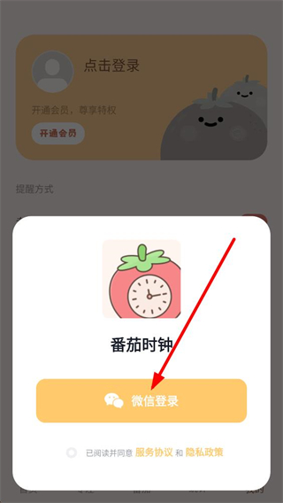 3、點擊登錄后會彈出登錄窗口,顯示番茄時鐘標識,可選擇微信登錄,同時需勾選已閱讀并同意相關協議和政策,完成登錄操作以使用更多功能。