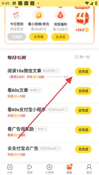 4、進入任務頁面可看到每日必做任務,如閱讀微信文章、看60s文章等,選擇感興趣的任務點擊去完成,完成任務獲取相應獎勵。