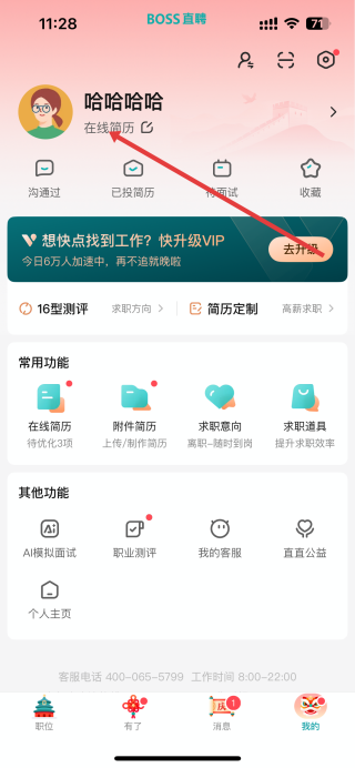 3、個人頁面,能看到用戶名、在線簡歷等信息,還有溝通、已投簡歷等功能入口,點擊在線簡歷進入簡歷頁面。