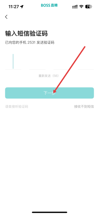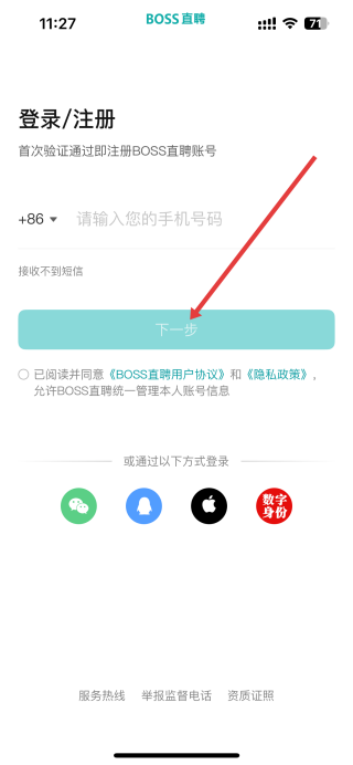 1、進入boss直聘登錄/注冊頁面,輸入手機號碼,勾選同意相關協議后,點擊下一步,進入短信驗證碼輸入界面。