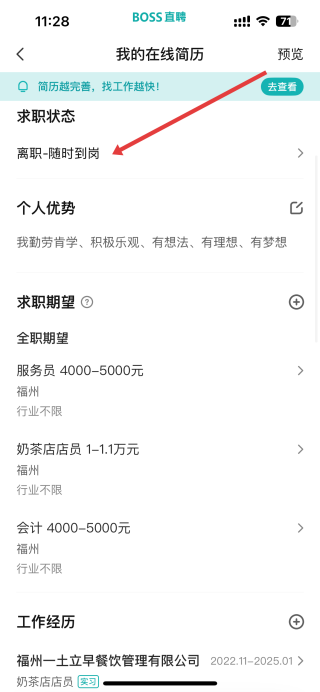 4、我的在線簡歷頁面,可查看求職狀態、個人優勢、求職期望、工作經歷等內容,還能點擊預覽查看簡歷整體情況。