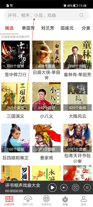 匯集各類評書作品,提供袁闊成、單田芳、劉蘭芳、田連元、連麗如等眾多評書表演藝術家的經典評書。