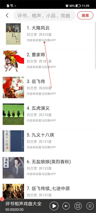 3、在搜索結果中選擇大隋風云這個評書內容,點擊進入該評書的詳情頁面。