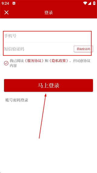 1、打開好享硯山平臺進入登錄頁面,輸入手機號碼,點擊獲取驗證碼,填入收到的驗證碼,勾選協議后點擊馬上登錄,完成賬號登錄。