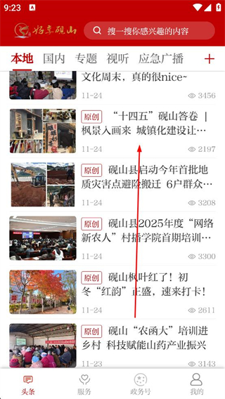2、登錄后進入首頁瀏覽本地國內等板塊的資訊列表,找到十四五硯山答卷相關的資訊條目,點擊該條目進入詳情頁面查看內容。