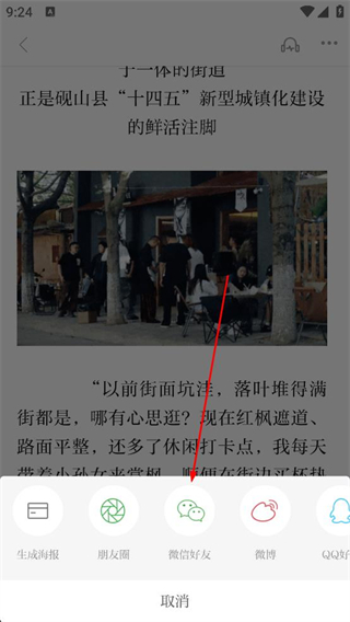 4、點擊分享按鈕彈出朋友圈微信好友等分享渠道選項,選擇對應的渠道,即可將這篇資訊分享給他人。