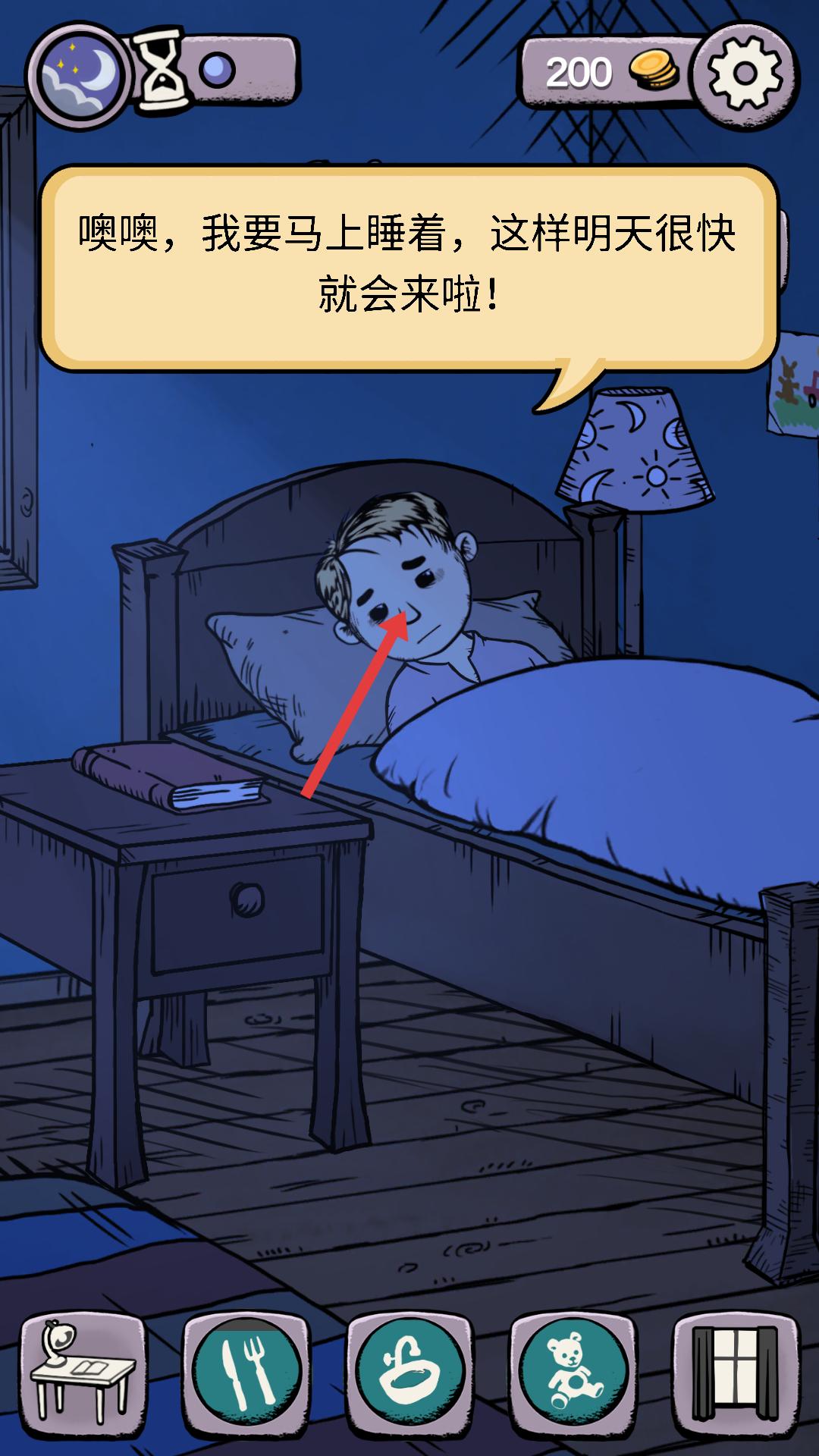4、后續克勞斯會躺在床上,出現想要盡快入睡的對話,此時可關注畫面中的互動元素,完成相關操作,讓游戲流程繼續。