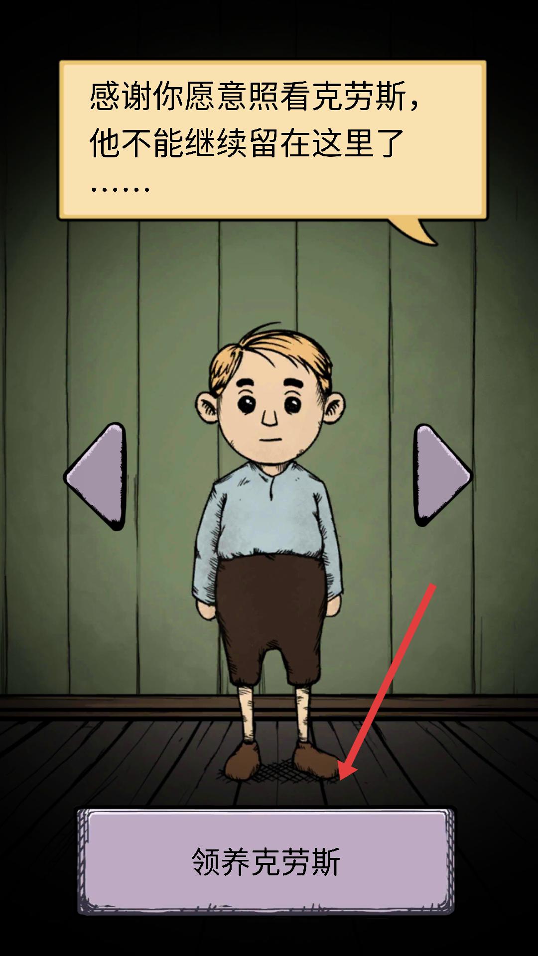 1、游戲初始,會出現關于照看克勞斯的提示,點擊領養克勞斯按鈕,即可開啟后續與克勞斯相關的游戲內容。