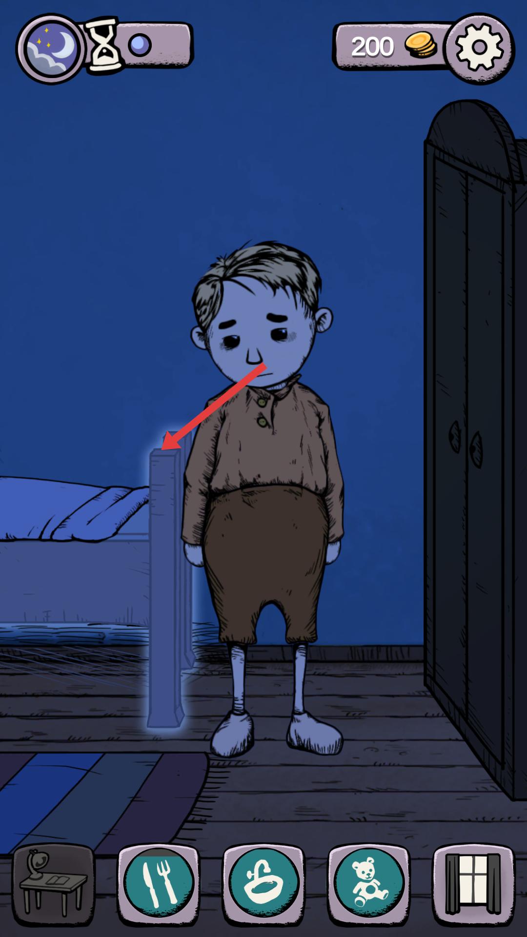 3、到了夜晚場景,克勞斯在臥室中,可點擊床等物品,與場景互動,可能會觸發相關的夜間情節。
