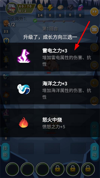 4、升級時會出現成長方向三選一的界面,可選擇雷電之力、海洋之力或怒火中燒等不同成長方向,提升角色屬性。