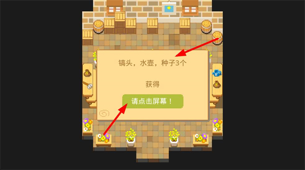 1、會彈出獲得道具的提示,包含鎬頭水壺和3個種子,點擊屏幕即可領取這些道具,開啟農場相關的操作流程。